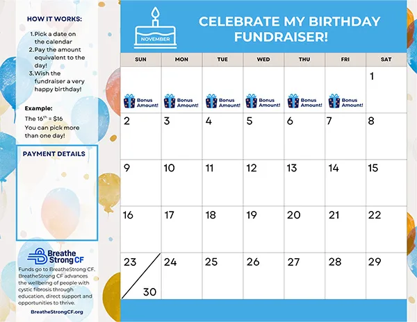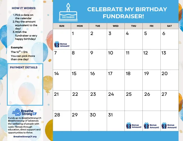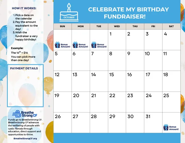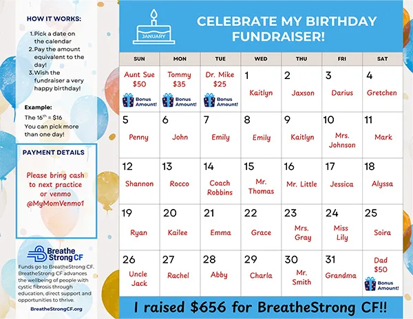 Each fundraiser downloads a calendar for their birthday month, and supporters “buy” days on it to raise funds for BreatheStrong CF.