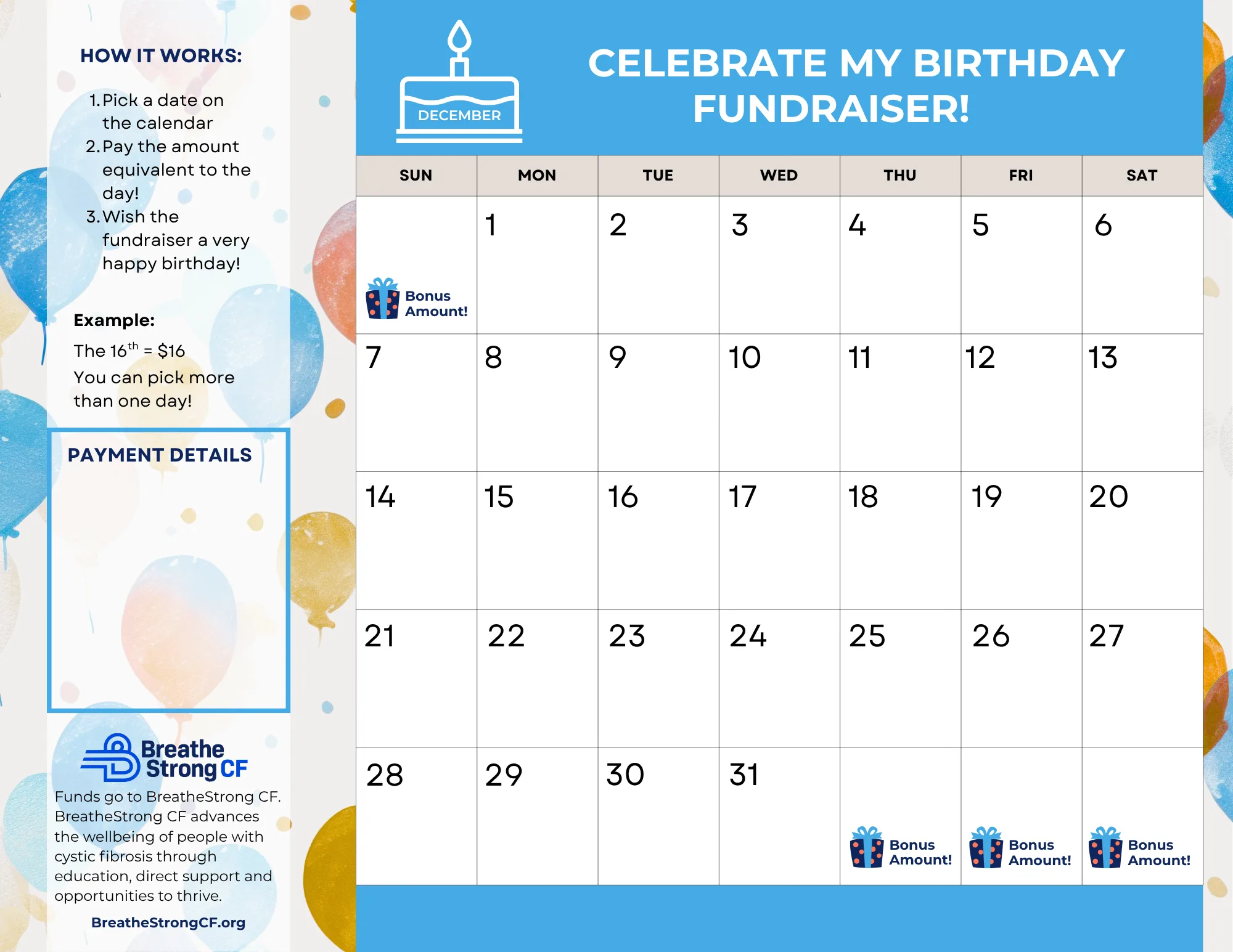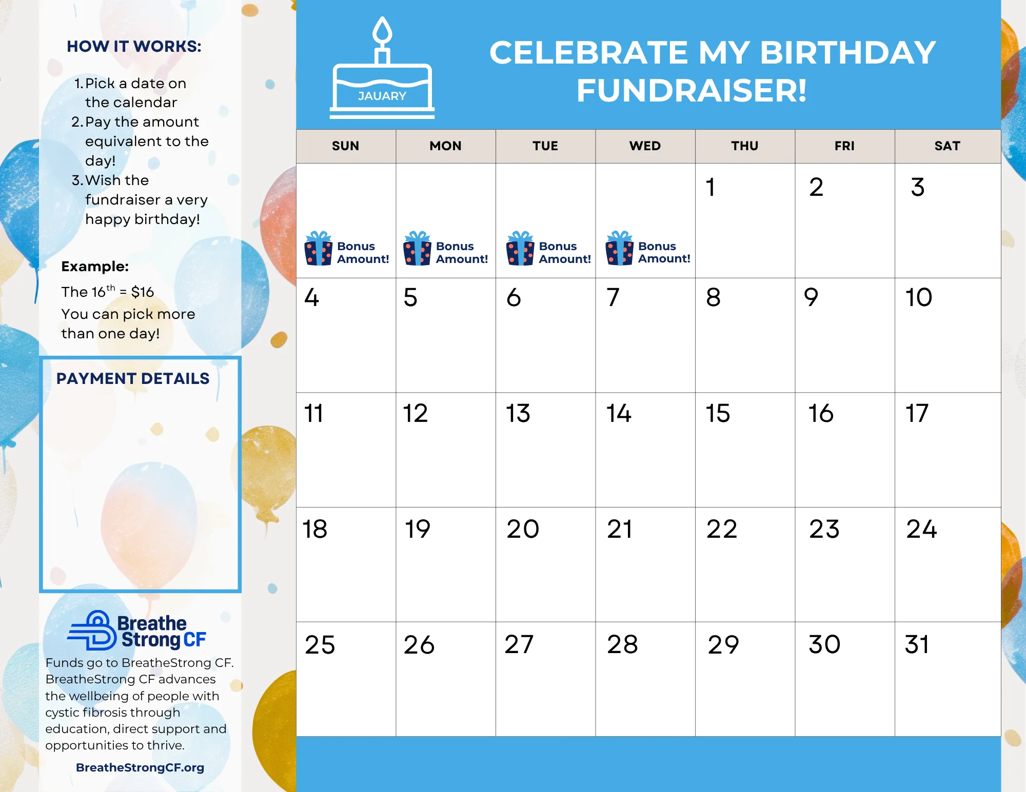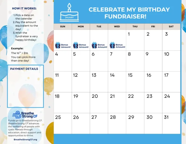 Download your birthday month calendar and ask friends and family to donate the amount equal to the day they choose. All funds donated raise funds for BreatheStrong CF.