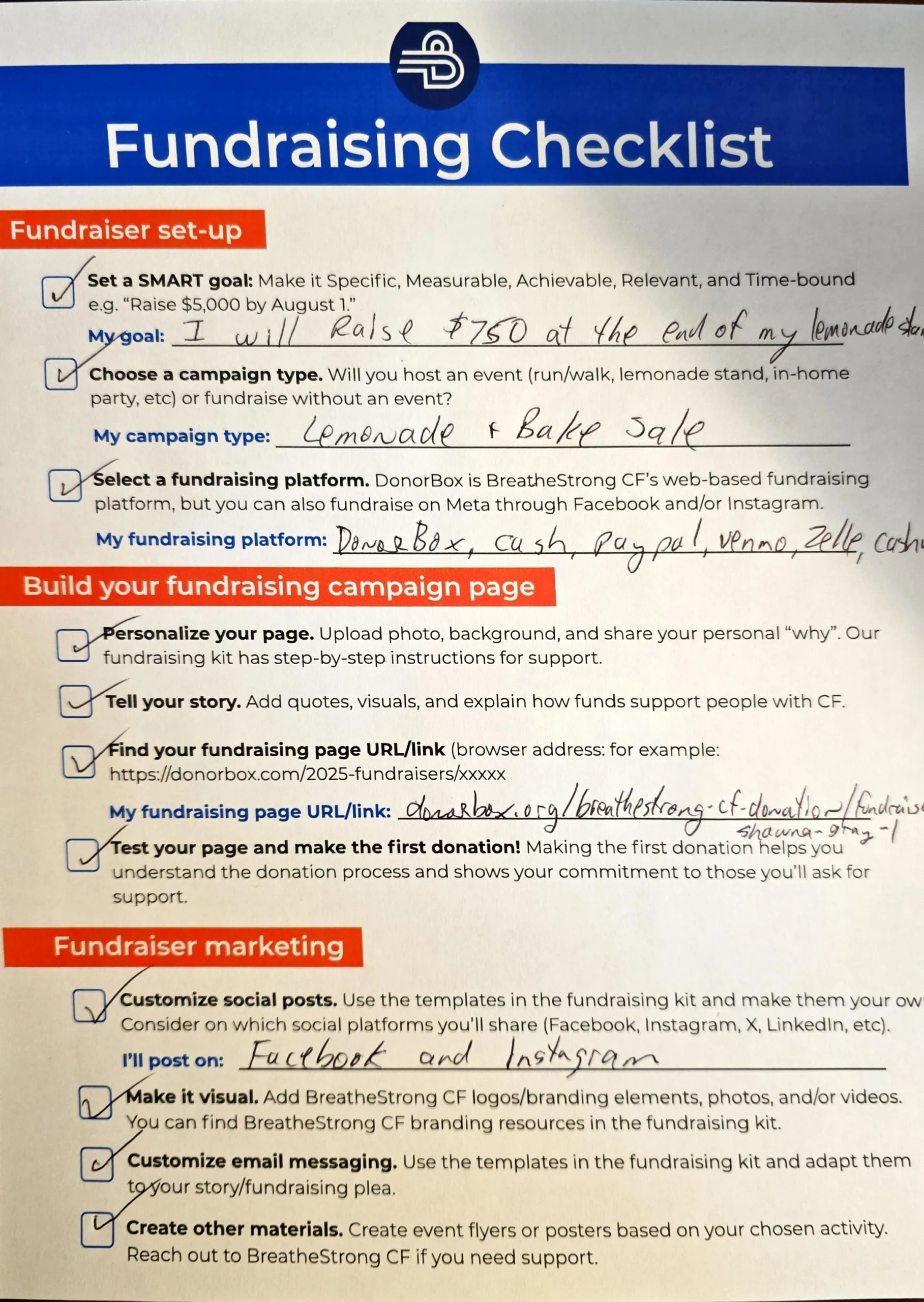Make a plan – The fundraising Checklist in the BreatheStrong CF Fundraising Kit was really helpful!