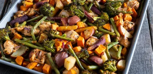 ● Sheet-pan meals (protein + frozen veggies + oil, roast everything together on the same